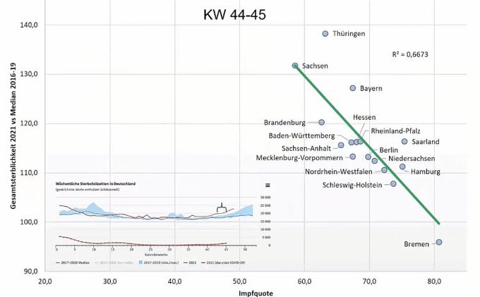 It also gets clearer the more data points you take. You can always find 2 that contradict, which is a favoured tactic (they'll find a state with slightly lower that Mass and lower death rate or higher than Indiana but also higher death rate) Here's the scatter plot of all german states and the calculated 'risk difference' on average: (Up is excess deaths, left to right vax uptake. Bremen is a 'city state', so a little bit of an outlier in terms of vax percentage, there's other cities within bigger states that get somewhat close at least. Data is from 4 weeks ago due to delay for excess death reporting, will be even clearer now most likely with Covid accounting for a larger percentage of deaths). And i am willing to bet the differences in vax uptake between the states are fairly similar across age groups (in germany the 'ranking' of vax uptake between the 16 states is almost entirely exactly the same regardless of age group, from seniors to kids, give or take 1 or 2 spots.) |
